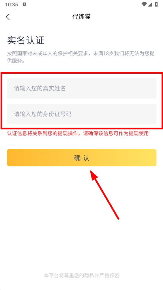 4、進入新頁面進行實名認證,在對應(yīng)輸入框填寫真實姓名和身份證號碼,點擊確認。