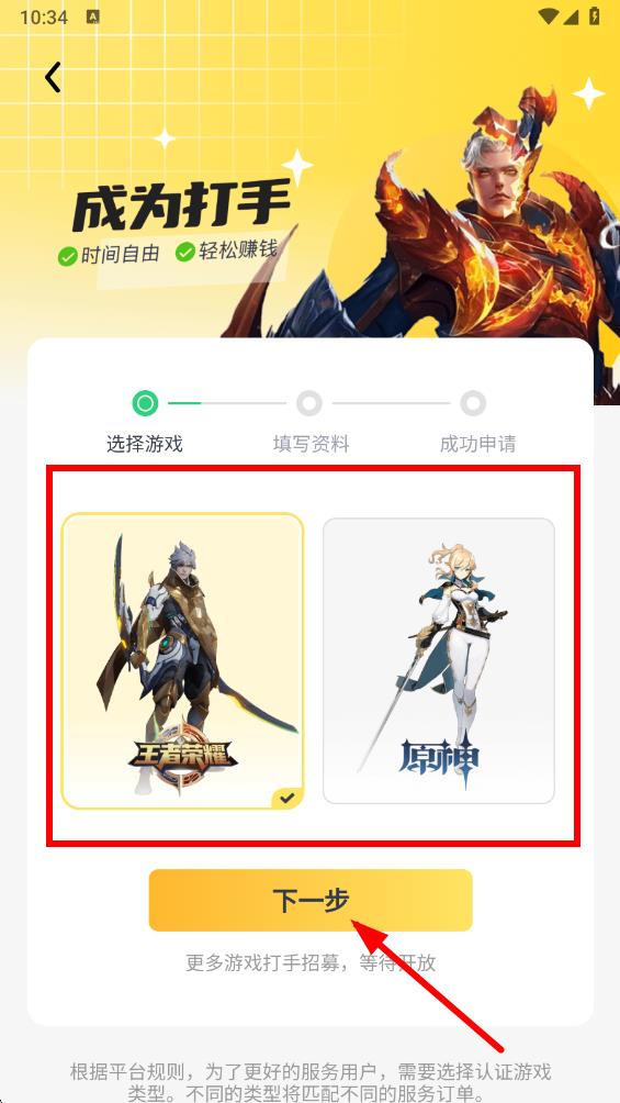 3、在申請頁面選擇想要代練的游戲,比如王者榮耀或原神,選擇后點擊下一步。