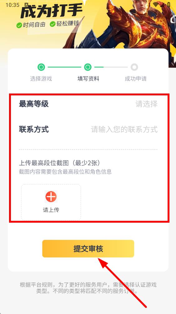 5、隨后填寫最高游戲等級、聯(lián)系方式,并上傳最最高段位和角色信息的截圖,最后點擊提交審核,等待平臺審核通過即可成為打手。