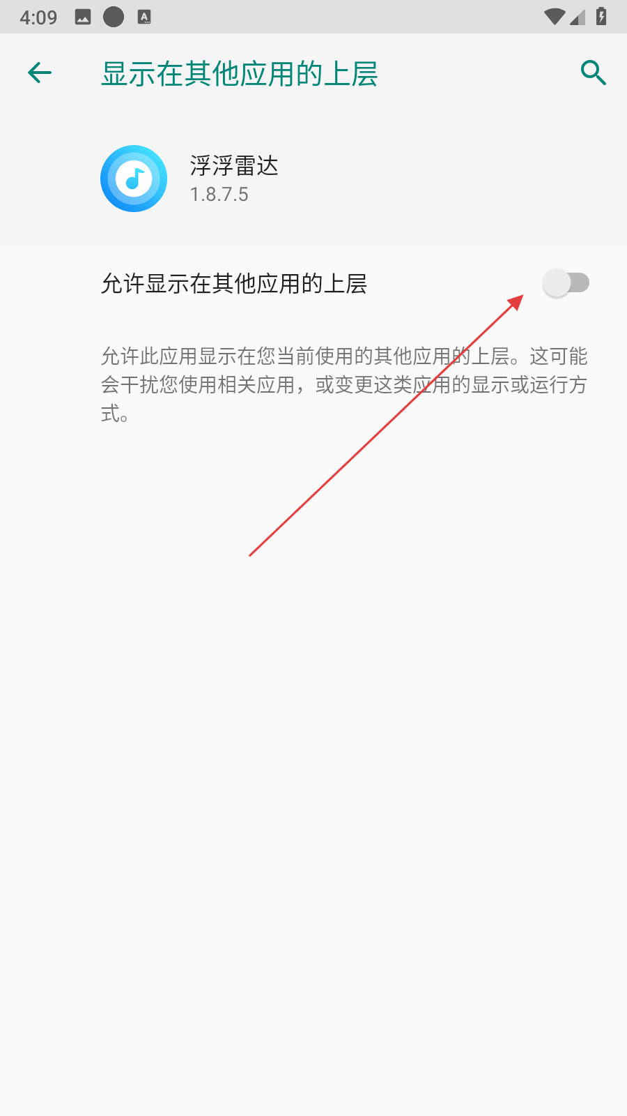 3、跳轉(zhuǎn)至手機系統(tǒng)的顯示在其他應(yīng)用的上層設(shè)置頁面,點擊允許顯示在其他應(yīng)用的上層右側(cè)的開關(guān),將其開啟。