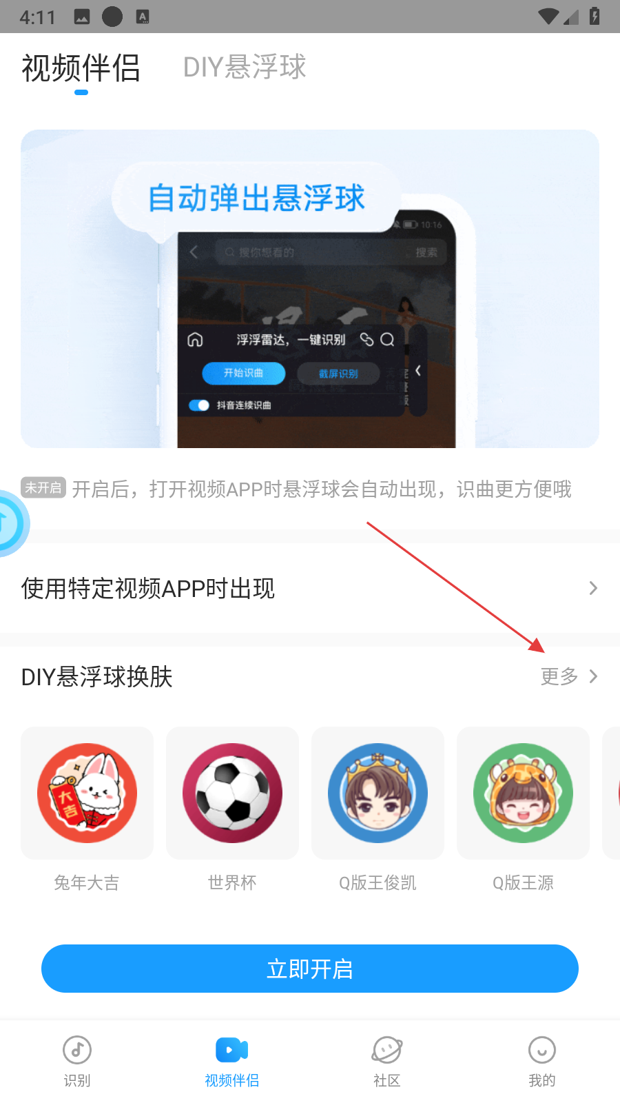 2、在視頻伴侶頁面中,找到DIY懸浮球換膚區(qū)域,點擊其右側(cè)的更多按鈕,進入DIY懸浮球皮膚選擇界面。