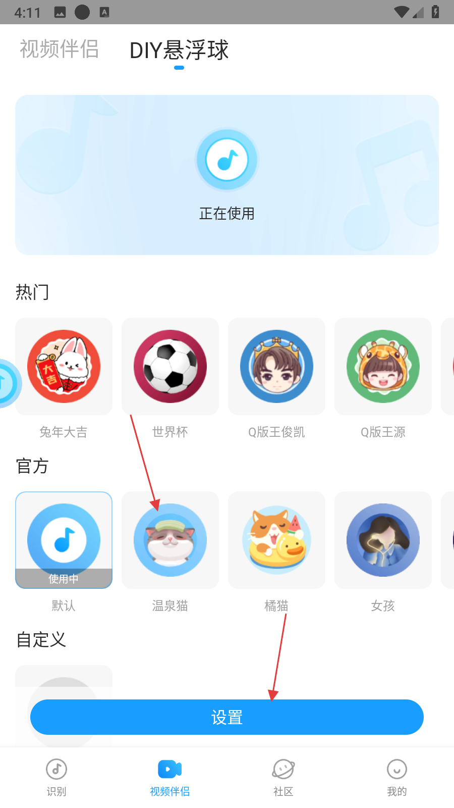 3、在DIY懸浮球皮膚界面,選擇自己喜歡的懸浮球皮膚,選中喜歡的皮膚后,點擊界面下方的設(shè)置按鈕。