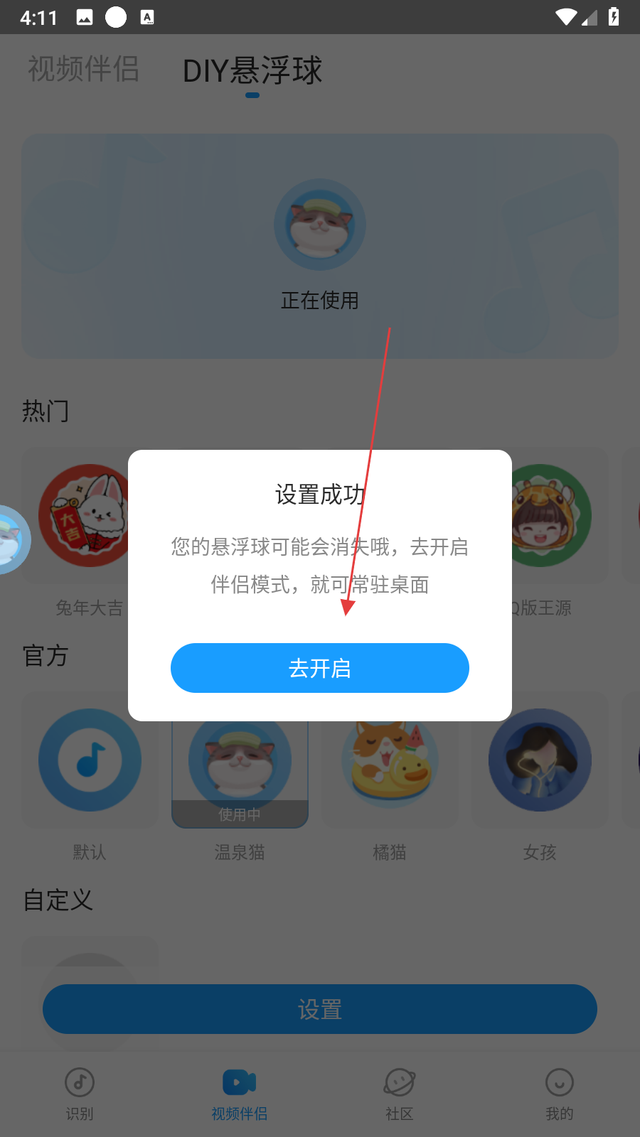 4、完成懸浮球皮膚的更換之后,若彈出去開啟伴侶模式可常駐桌面的提示,可根據(jù)需求點擊去開啟設(shè)置即可。