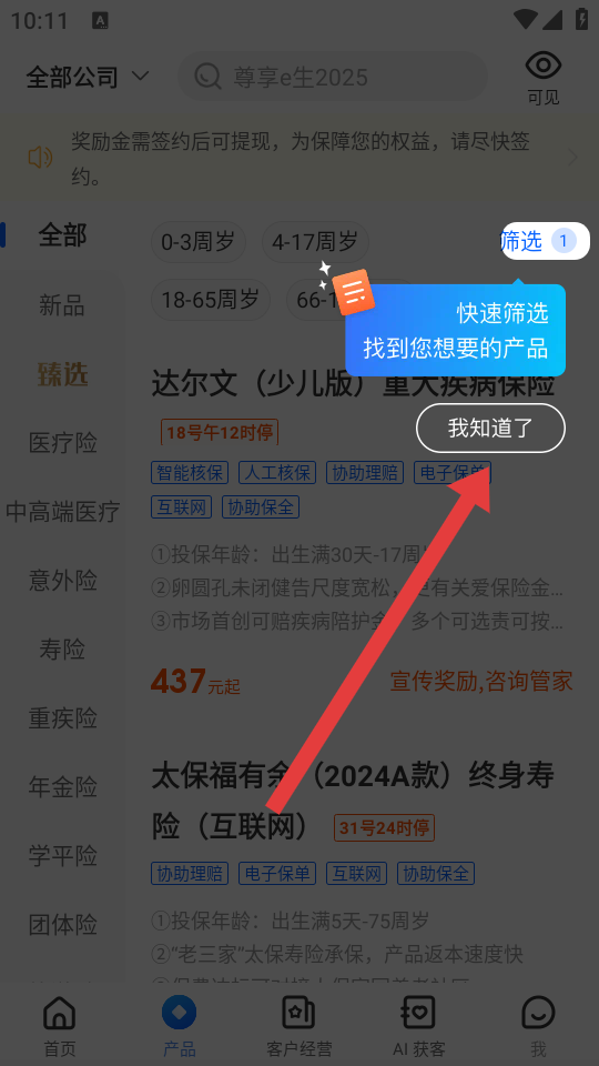 1、在產(chǎn)品瀏覽頁,點擊彈窗的我知道了,關(guān)閉快速篩選的提示,然后繼續(xù)查看保險產(chǎn)品信息。