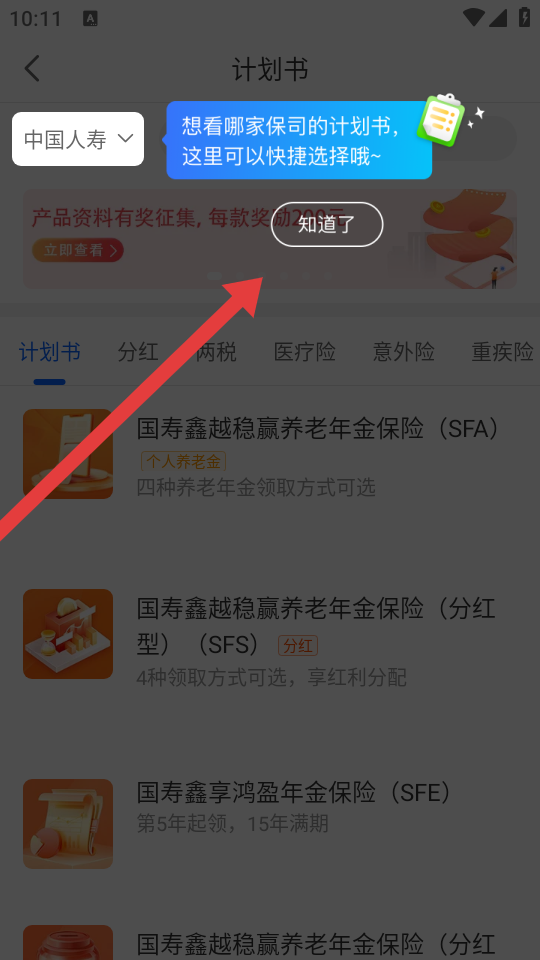 2、進(jìn)入計劃書頁面,點擊彈窗的知道了,關(guān)閉保司選擇指引提示,便捷篩選保險公司計劃書。