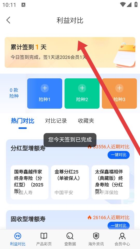 3、打開利益對比頁面,查看累計簽到1天的信息,可添加險種進(jìn)行利益對比,查看熱門對比數(shù)據(jù)。