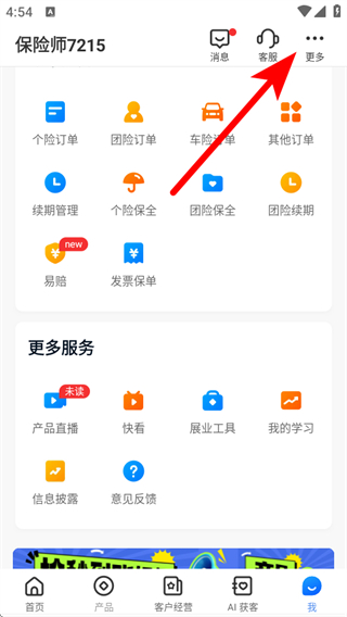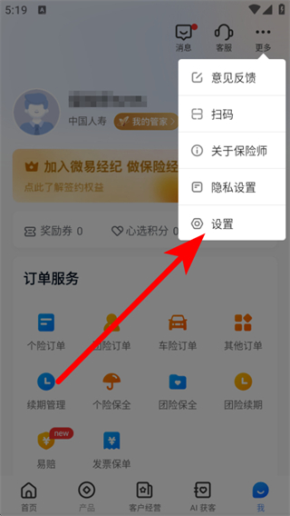 1、打開保險師APP我的頁面,點擊右上角更多,展開功能菜單。