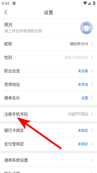 3、在設(shè)置頁面,找到并點擊注冊手機號,進(jìn)入修改手機號頁面。
