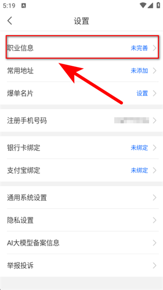 4、在設(shè)置頁面,點擊職業(yè)信息,按照提示填寫相關(guān)職業(yè)信息。