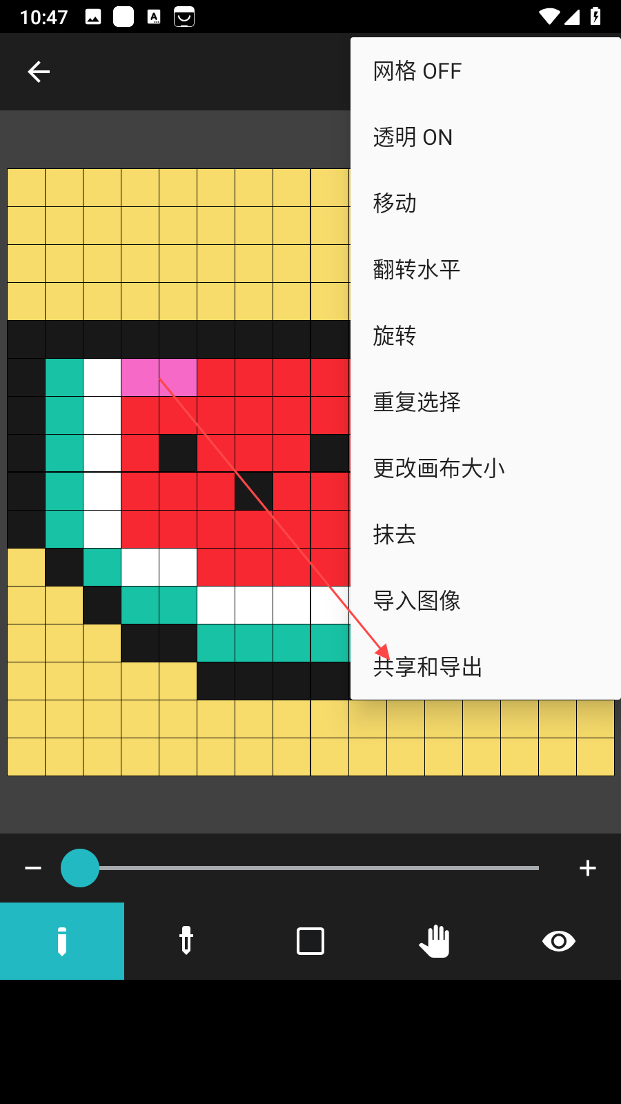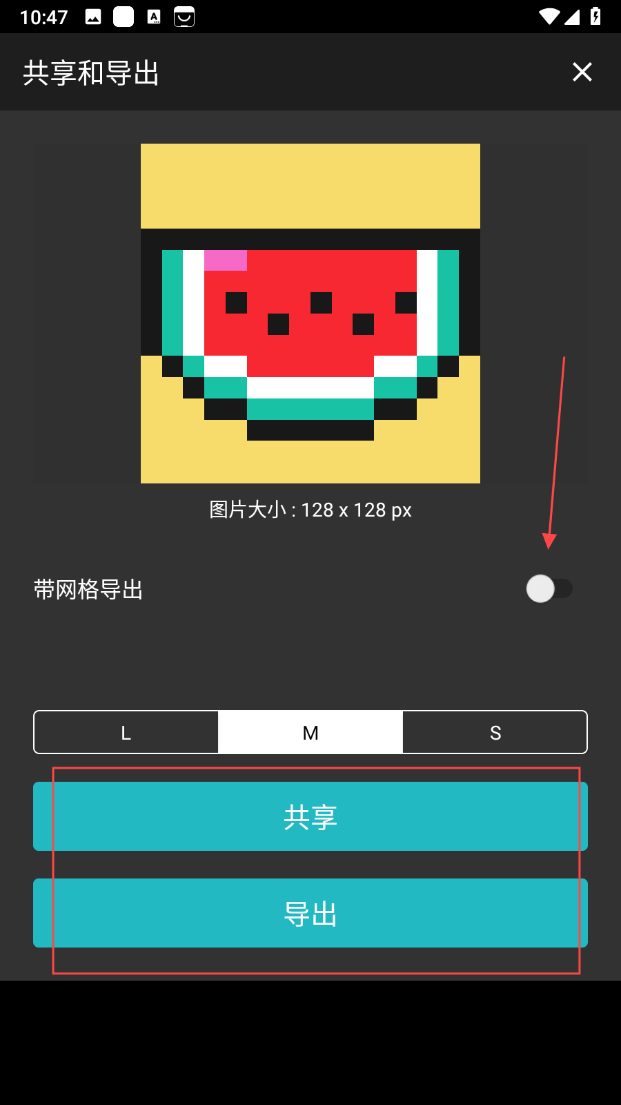 3、在共享和導(dǎo)出頁面,可以選擇是否帶網(wǎng)格導(dǎo)出作品,還能調(diào)整圖片大小,設(shè)置完成后,點(diǎn)擊下方的共享按鈕,根據(jù)手機(jī)系統(tǒng)提示選擇想要分享到的社交平臺或應(yīng)用,完成作品分享。