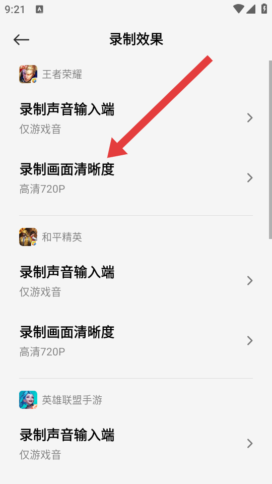 3、在錄制效果頁(yè)面,點(diǎn)擊對(duì)應(yīng)游戲的錄制畫(huà)面清晰度選項(xiàng),展開(kāi)選擇列表。