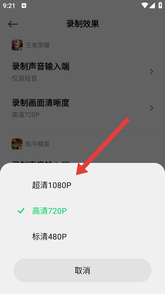 4、在清晰度選擇列表里,點(diǎn)擊超清1080P,即可將錄制清晰度設(shè)置為最高。