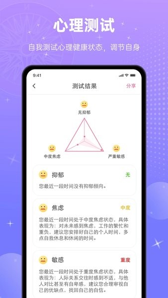 b、準(zhǔn)確解析,無(wú)論是星座測(cè)試還是心理測(cè)試題,軟件都能夠提供精準(zhǔn)的解讀和評(píng)估;