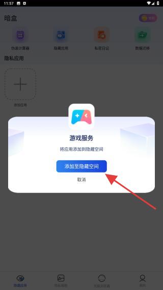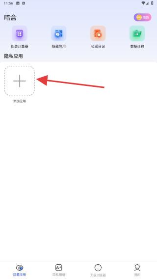 1、打開暗盒應(yīng)用軟件,在首頁內(nèi),隱私應(yīng)用下點擊添加應(yīng)用的功能按鈕。