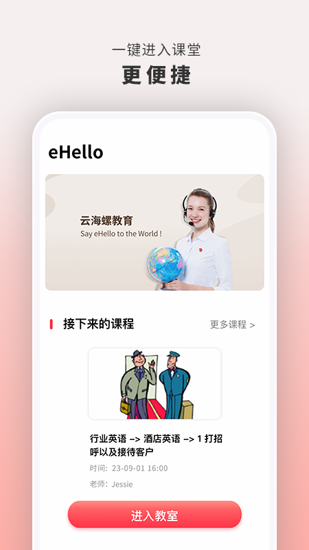 1、一鍵進入:簡單的點擊,即可進入云海螺在線1對1app,便捷高效地開始的英語口語培訓之旅;
