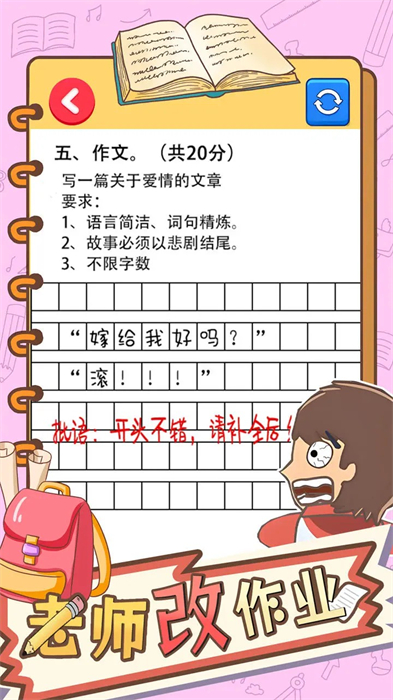 老師改作業(yè)是一款休閑主題的錯(cuò)題改正類(lèi)游戲,玩家將需要扮演一個(gè)語(yǔ)文老師,在游戲中通過(guò)批改不同的語(yǔ)文試卷并找出錯(cuò)誤,以順利通關(guān)關(guān)卡,游戲的試卷和劇情設(shè)計(jì),可以讓玩家在愉快的游戲過(guò)程中學(xué)習(xí)和提高語(yǔ)文水平,此外,對(duì)于語(yǔ)文學(xué)習(xí)者來(lái)說(shuō),這款游戲不僅是一種愉快的娛樂(lè)方式,更可以提高他們的語(yǔ)文水平。