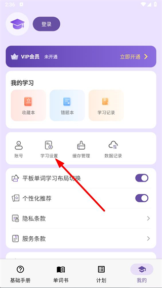 2、在個(gè)人頁(yè)面里,找到并點(diǎn)擊學(xué)習(xí)設(shè)置選項(xiàng),進(jìn)入學(xué)習(xí)設(shè)置界面。