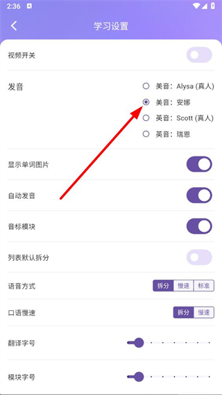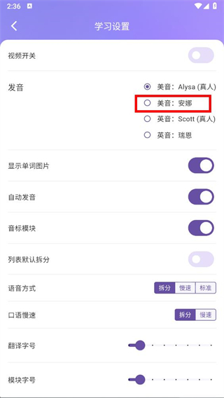 3、在學(xué)習(xí)設(shè)置界面中,在多項(xiàng)發(fā)音選擇項(xiàng)里,找到美音選項(xiàng)。