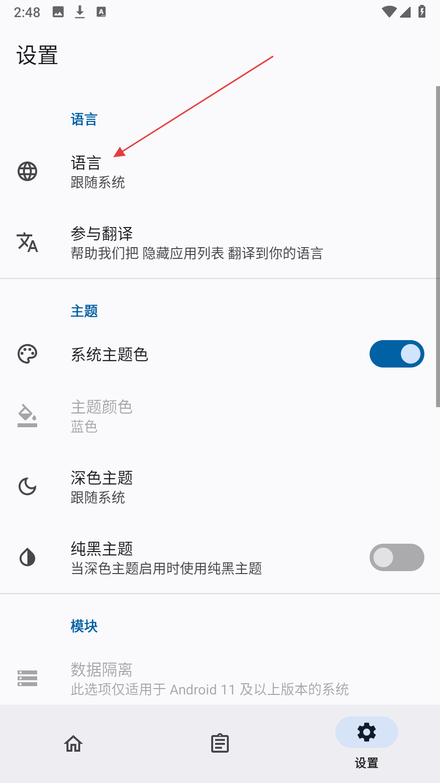 2、在設(shè)置頁(yè)面中找到語(yǔ)言選項(xiàng),點(diǎn)擊該選項(xiàng),展開語(yǔ)言選擇列表。