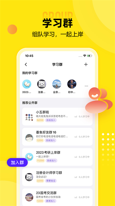 2、組隊學(xué)習(xí):輕松創(chuàng)建學(xué)習(xí)小組,或者加入已有的學(xué)習(xí)小組,與小組成員一起相互鼓勵;