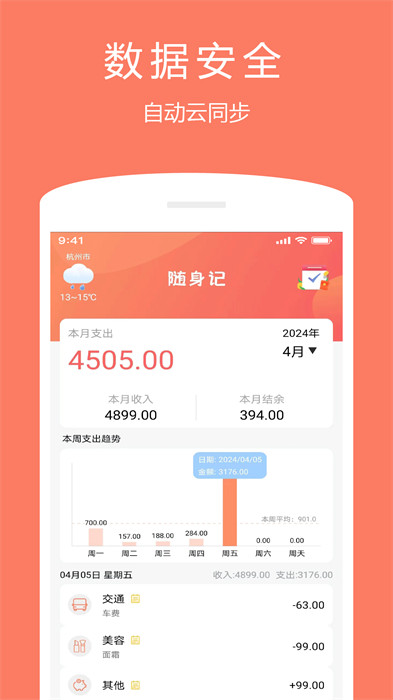 隨身記溫暖記賬app是一款完全免費(fèi)的記錄賬單的工具,整個(gè)軟件的頁(yè)面和圖標(biāo)都顯示的非常美觀,并且記錄的小圖標(biāo)還能根據(jù)自己的記錄項(xiàng)目進(jìn)行定制,挑選到最合適的圖標(biāo)增加整個(gè)賬單的趣味性,并且所有的賬單會(huì)通過(guò)圖表的方式進(jìn)行展示出來(lái),大家可以明確的看到最近的開(kāi)支和消費(fèi)情況,十分的便利,不僅如此,用戶還能在線累計(jì)記錄的積分,兌換一些實(shí)用的工具,隨時(shí)開(kāi)啟自己的日常記賬生活。