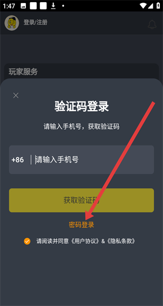 3、在驗證碼登錄頁面點擊“密碼登錄”,進入密碼登錄頁面。