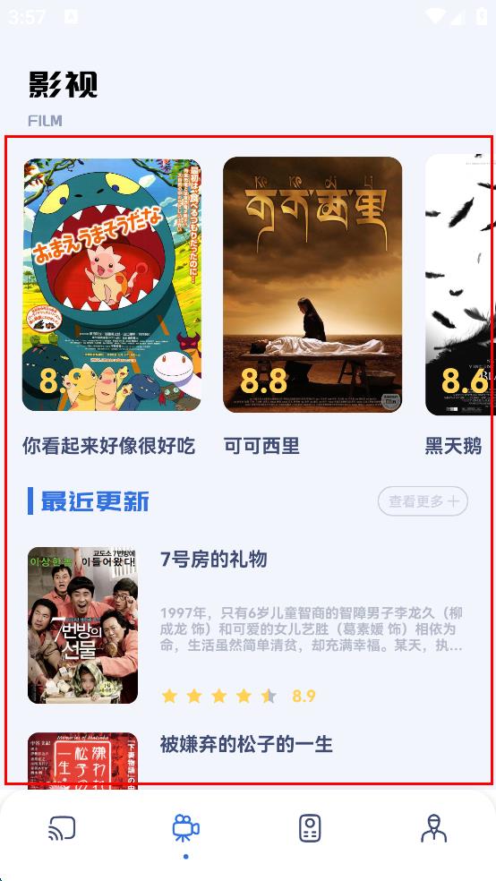 2、在APP主界面,可看到“視頻投屏”“圖片投屏”等功能選項,以及“影視”板塊,點擊底部影視相關(guān)圖標(biāo),進(jìn)入影視頁面。