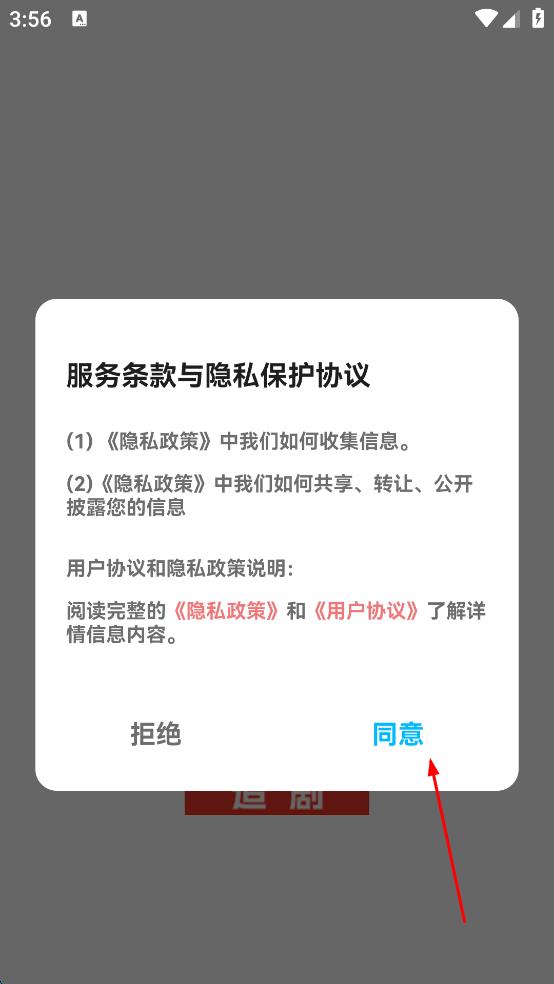 1、打開影視類APP,彈出服務(wù)條款與隱私保護(hù)協(xié)議提示框,仔細(xì)閱讀相關(guān)內(nèi)容后,點擊“同意”按鈕,進(jìn)入APP主界面。