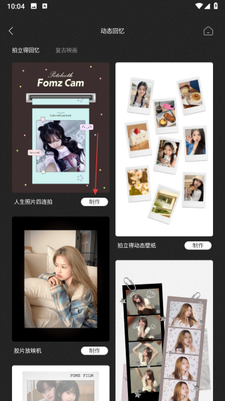 1、打開Fomz應(yīng)用,在功能選擇頁面找到動態(tài)回憶選項(xiàng)并點(diǎn)擊,進(jìn)入動態(tài)回憶的模板選擇界面。