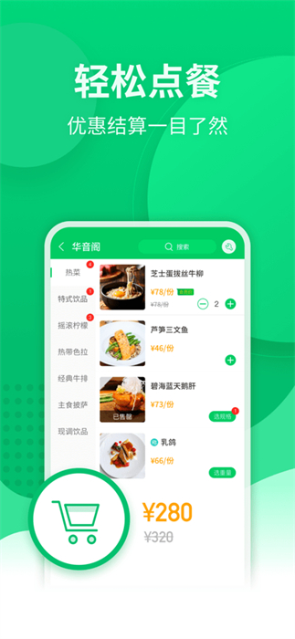 1、快速點(diǎn)餐:能夠通過軟件快速瀏覽當(dāng)前餐廳的菜單,從而快速進(jìn)行線上點(diǎn)單;