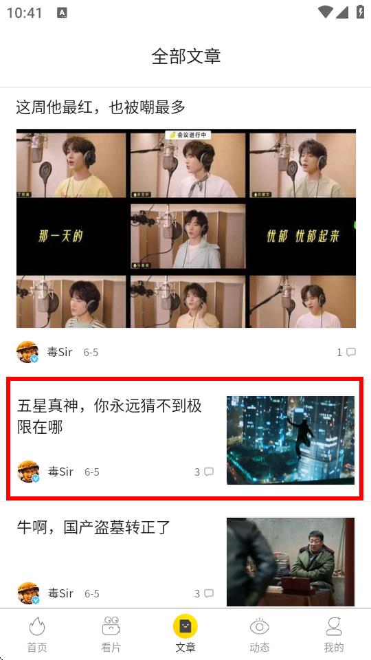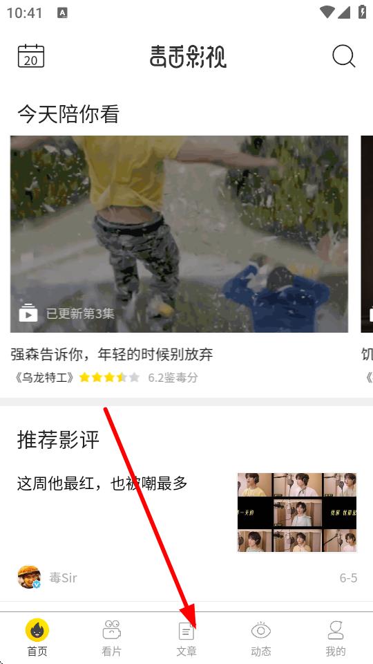 1、打開毒舌影視APP,點(diǎn)擊底部導(dǎo)航欄中的文章選項(xiàng),進(jìn)入全部文章頁(yè)面。