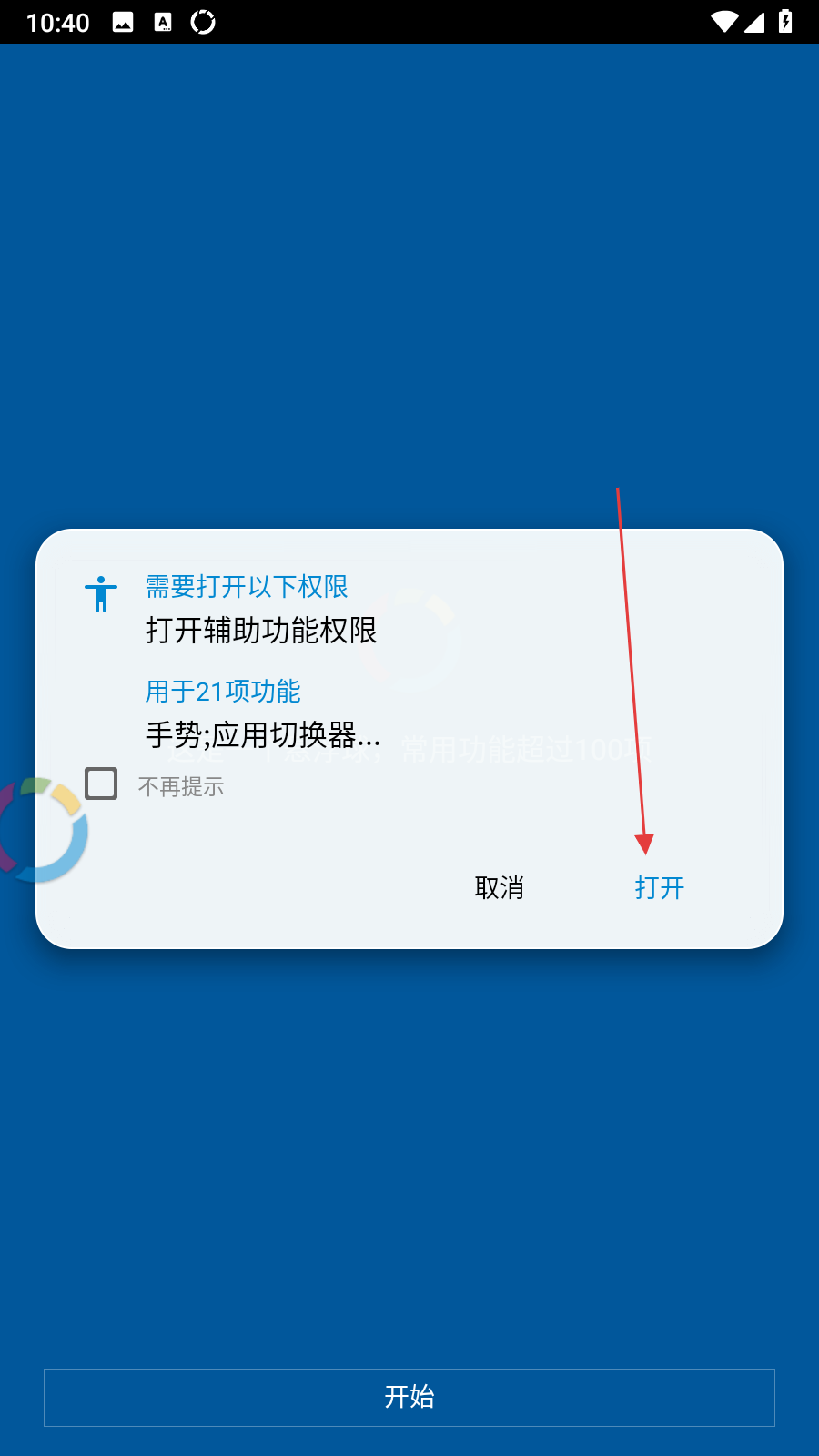 1、打開FV懸浮球,會(huì)彈出需要打開輔助功能權(quán)限的提示框,點(diǎn)擊打開按鈕,進(jìn)入手機(jī)的無障礙設(shè)置頁面。
