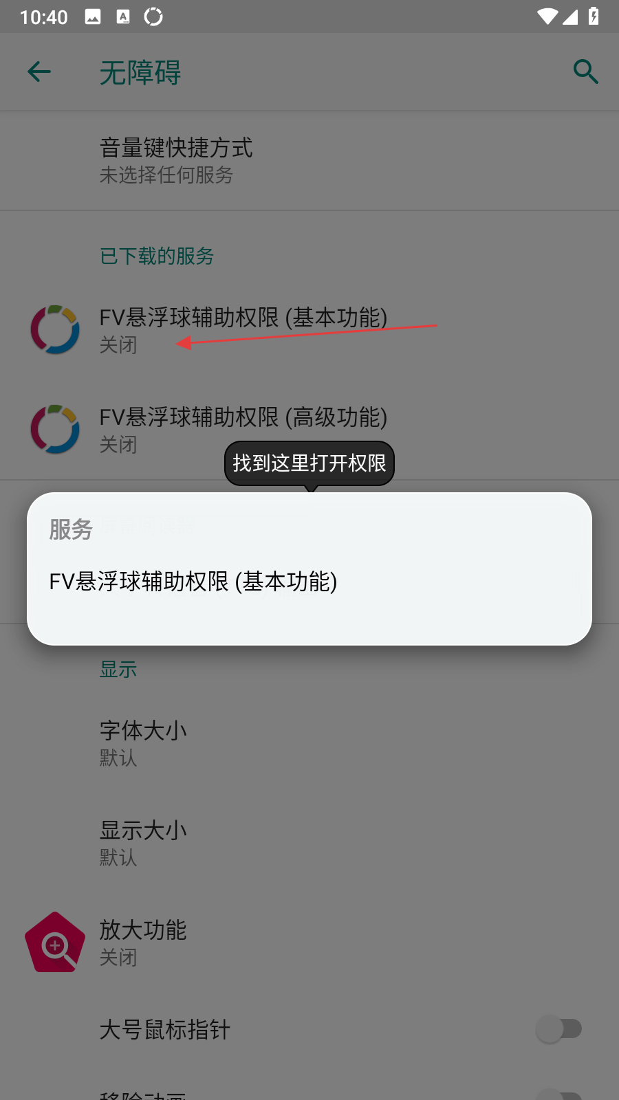 2、在無障礙設(shè)置頁面中,找到FV懸浮球輔助權(quán)限選項(xiàng)并點(diǎn)擊進(jìn)入。