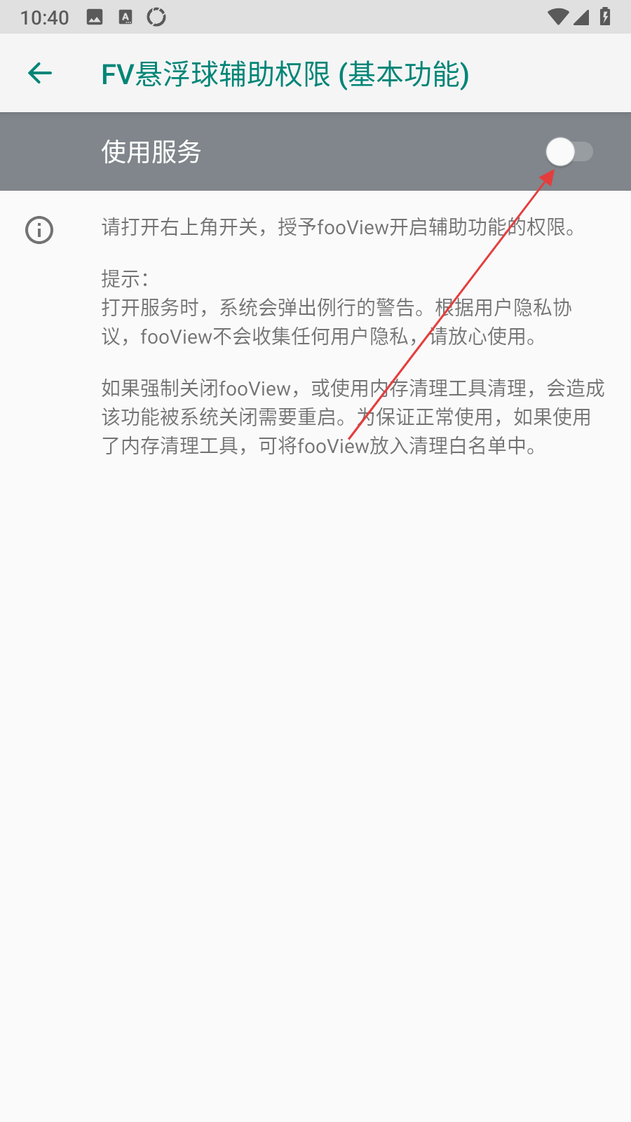 3、進(jìn)入FV懸浮球輔助權(quán)限頁面后,點(diǎn)擊使用服務(wù)右側(cè)的開關(guān),將其開啟。