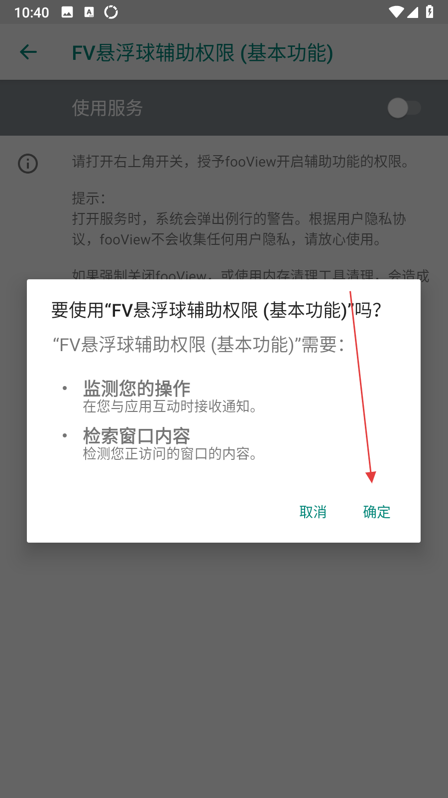 4、此時(shí)會(huì)彈出權(quán)限確認(rèn)彈窗,提示要使用‘FV懸浮球輔助權(quán)限嗎,點(diǎn)擊確定按鈕,完成輔助功能權(quán)限的打開操作。