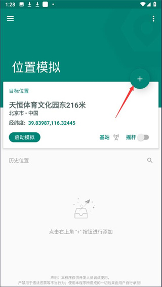 1、打開APP后,點(diǎn)擊位置模擬右側(cè)的加號(hào);
