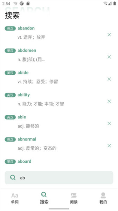 b、強大搜索,根據(jù)當(dāng)前英文的首字母進行分類,可以快速搜索相關(guān)詞匯;