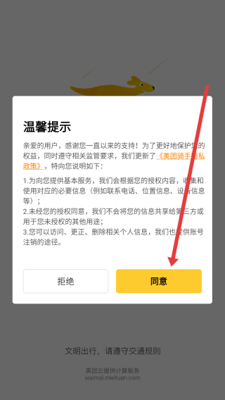 1、打開美團(tuán)騎手app后,可以點擊彈窗中的同意按鈕,進(jìn)入使用。