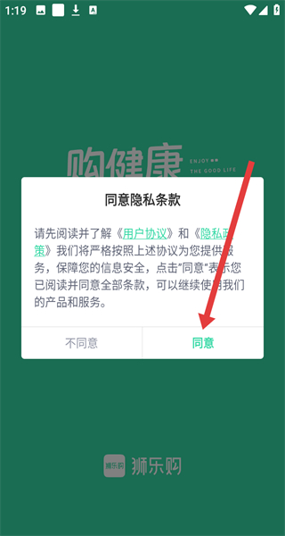 1、點擊“同意隱私條款”彈窗的“同意”,進入獅樂購APP首頁。