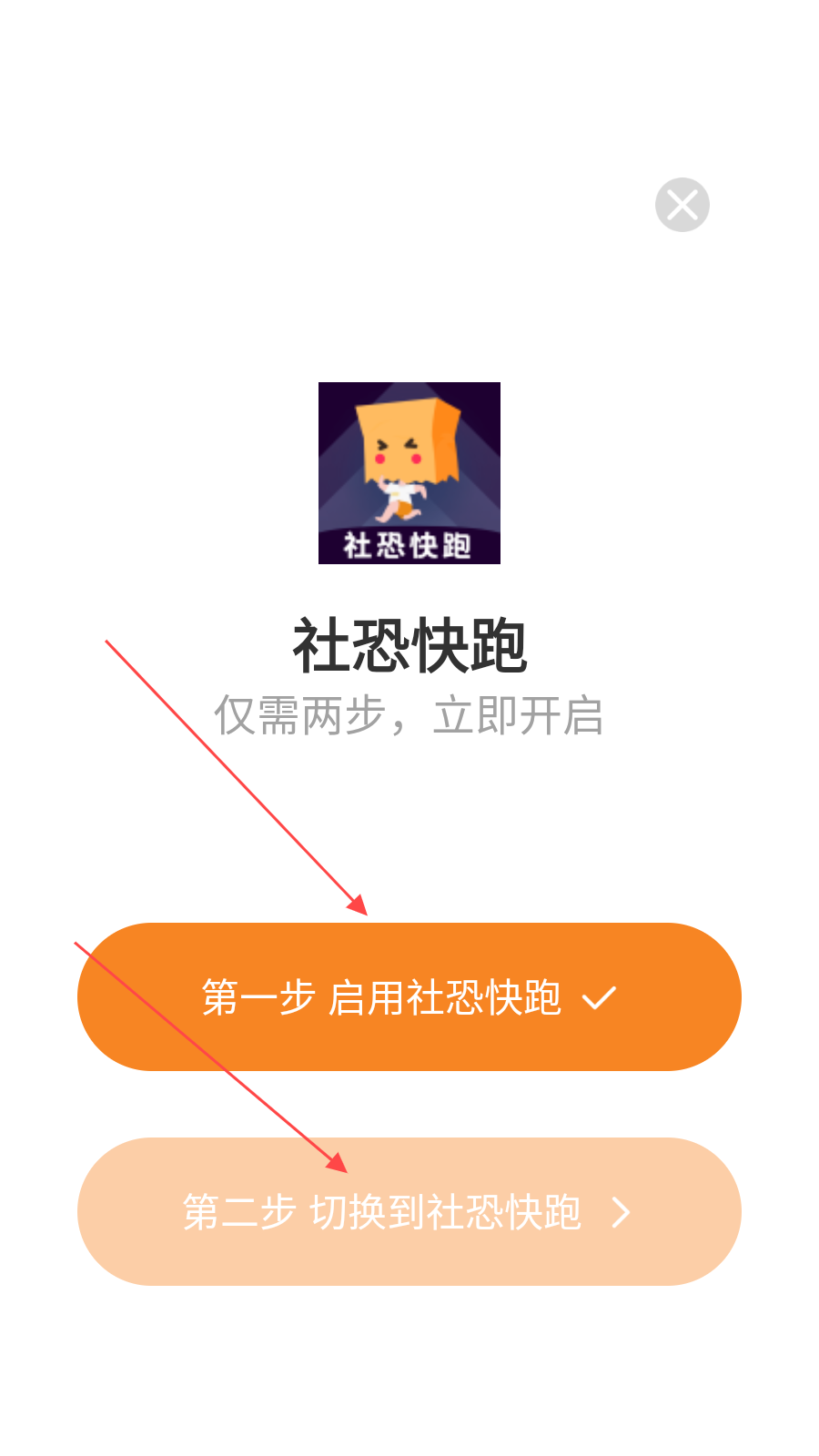 1、打開(kāi)社恐快跑應(yīng)用,點(diǎn)擊初始界面第一步啟用社恐快跑,在手機(jī)設(shè)置里按提示啟用相關(guān)權(quán)限,隨后點(diǎn)擊第二步切換到社恐快跑,完成輸入法切換。