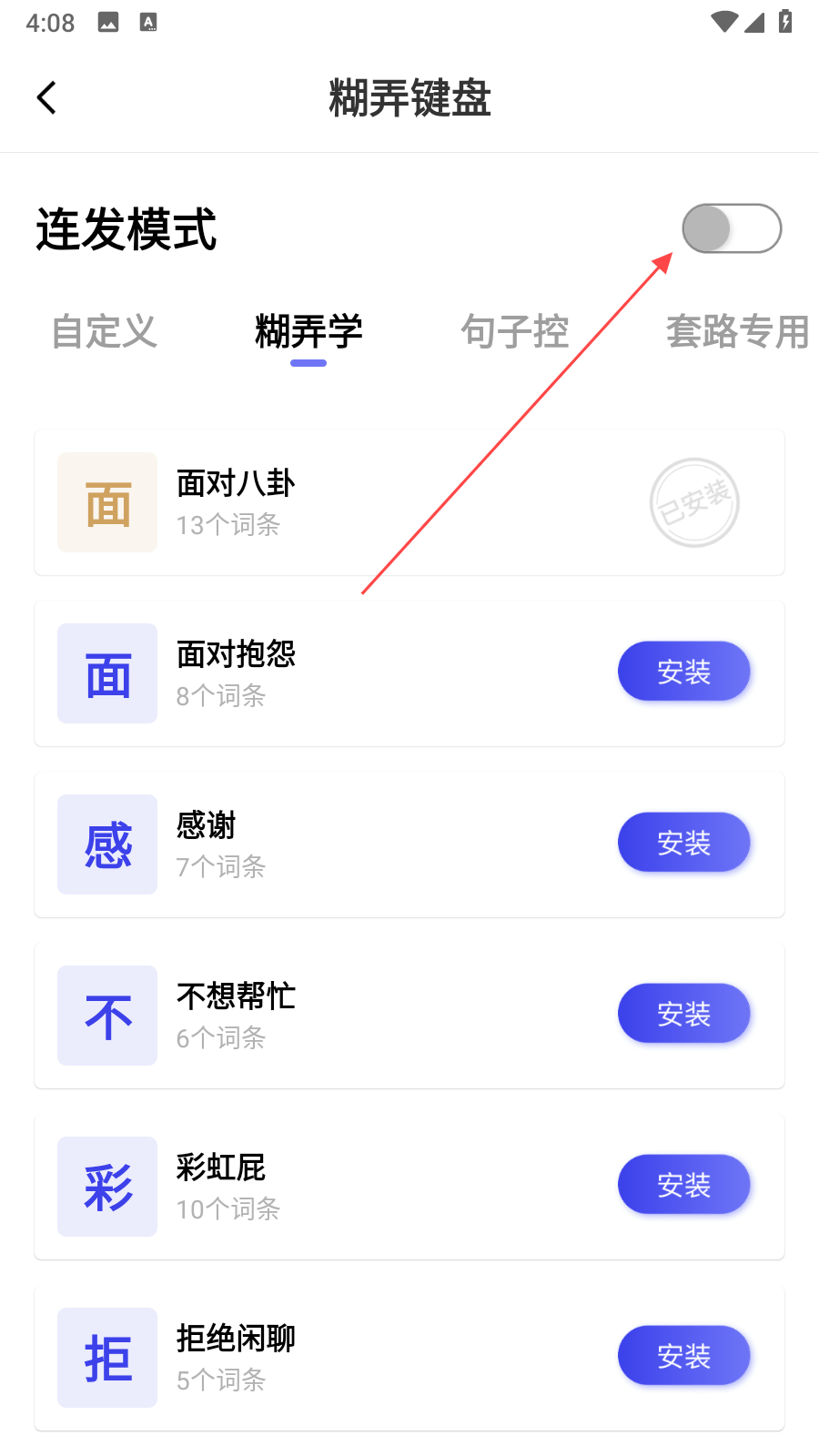 2、進(jìn)入應(yīng)用首頁(yè),找到并點(diǎn)擊糊弄鍵盤(pán)選項(xiàng),在界面中可看到自定義,糊弄學(xué)等分類,選擇所需詞條如面對(duì)八卦,不想幫忙等,點(diǎn)擊安裝將詞條詞包裝入輸入法。