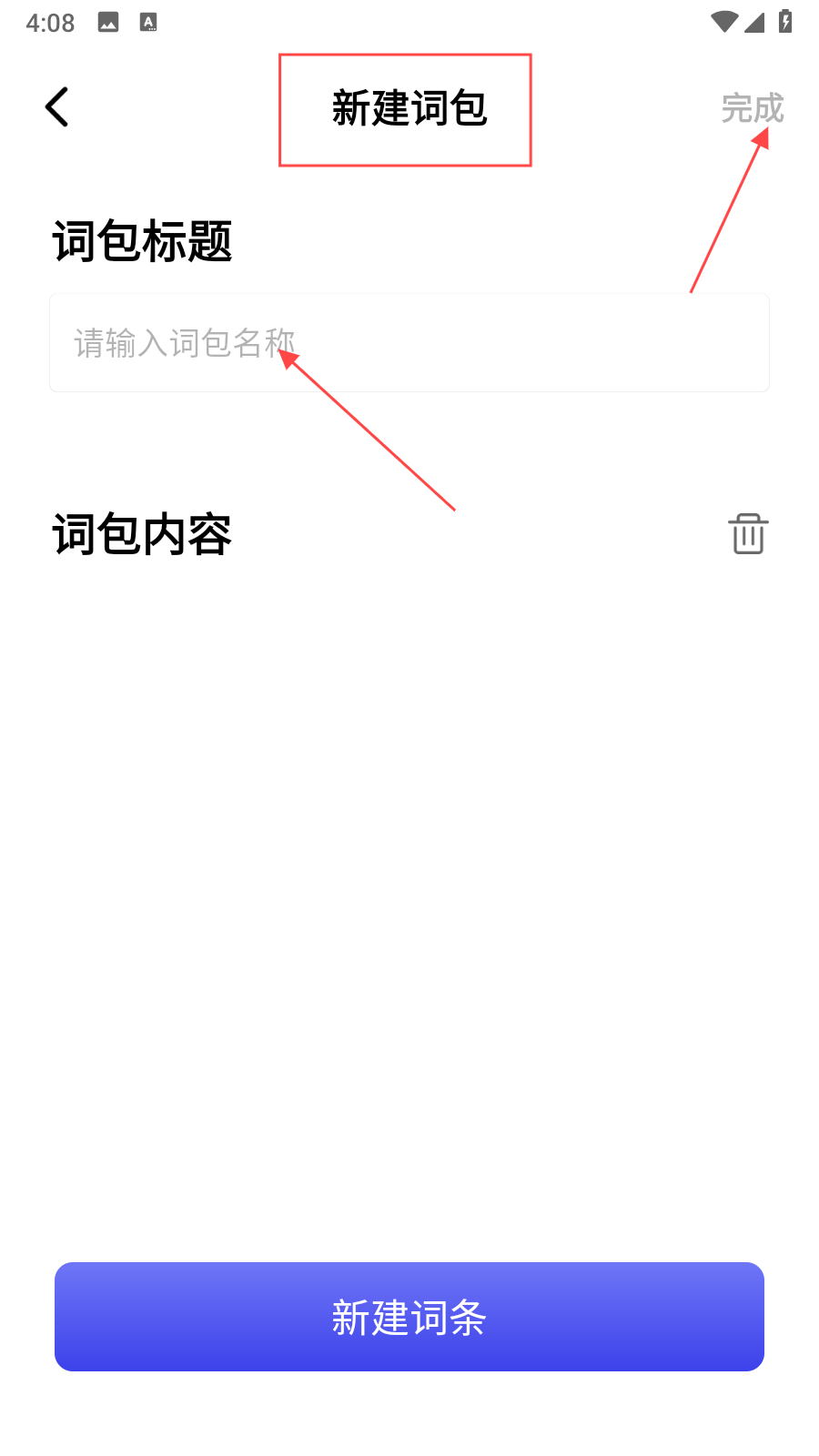3、若預(yù)設(shè)詞條不滿足需求,點(diǎn)擊新建詞包,輸入詞包標(biāo)題,再點(diǎn)擊新建詞條添加自定義內(nèi)容,完成后點(diǎn)擊完成保存,打開(kāi)糊弄鍵盤(pán)點(diǎn)擊詞條即可發(fā)送回復(fù)。
