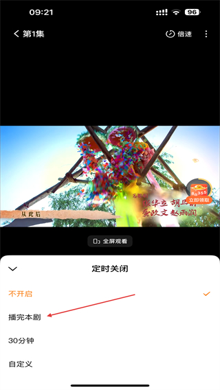 4、在選項(xiàng)中,選擇并點(diǎn)擊播完本劇的按鈕即可完成定時(shí)。