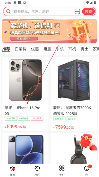 1、打開(kāi)喵喵折APP,在首頁(yè)瀏覽推薦商品,找到想要購(gòu)買的商品后點(diǎn)擊進(jìn)入其比價(jià)購(gòu)買頁(yè)面。