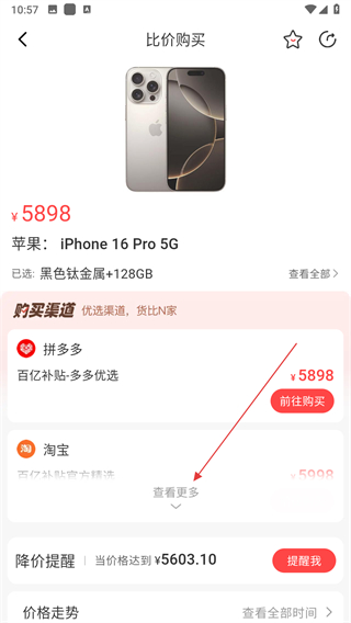 2、在比價(jià)購(gòu)買頁(yè)面,點(diǎn)擊查看更多,查看該商品在拼多多、淘寶、京東等多個(gè)平臺(tái)的售價(jià)及購(gòu)買渠道。