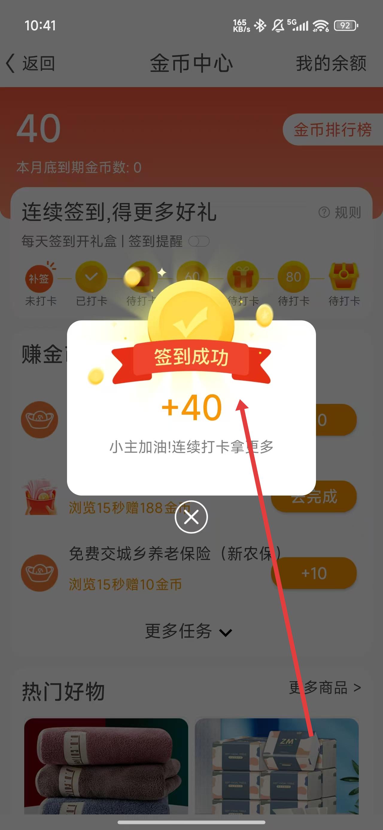 3、在進入到簽到頁面后,即可簽到成功并獲取40金幣獎勵。