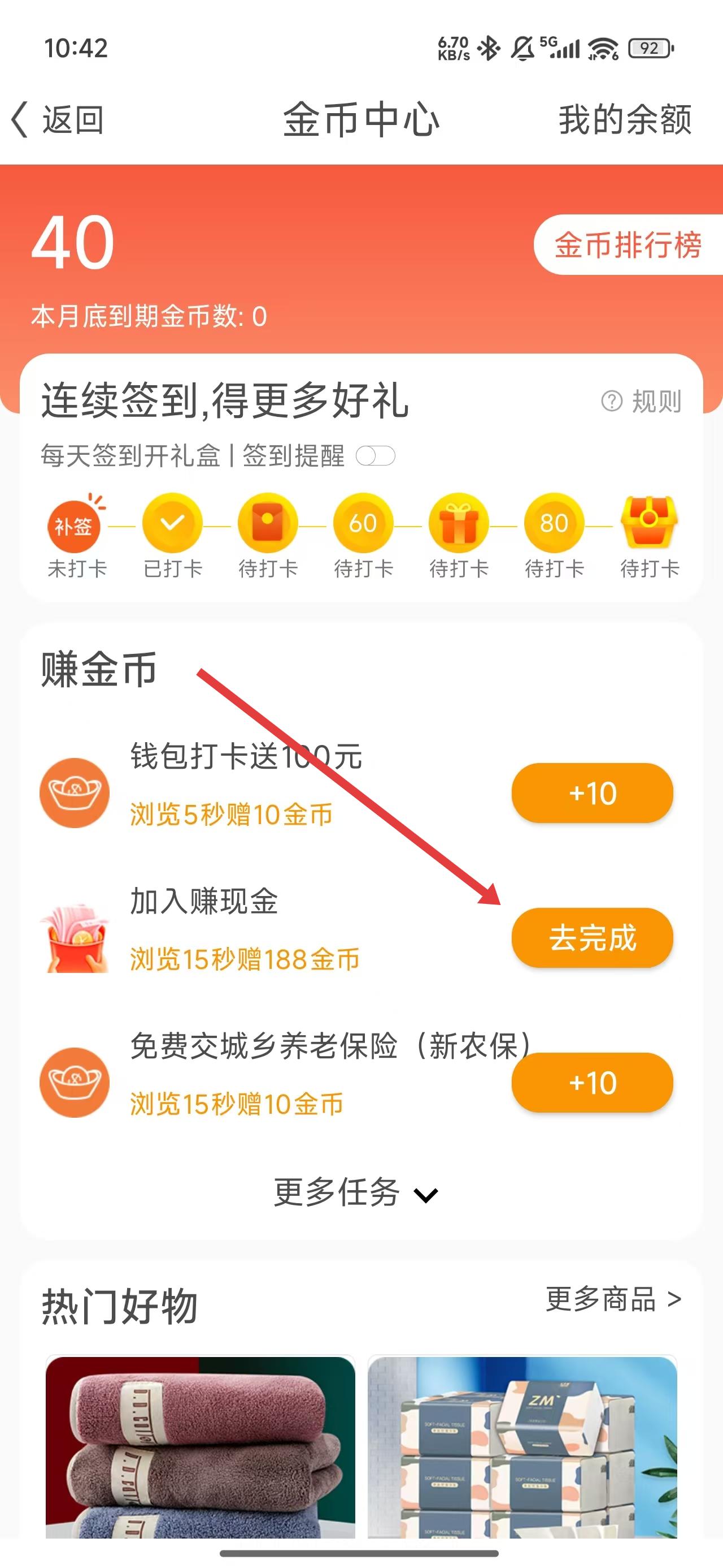4、可以通過點擊下方去完成按鈕,跳轉頁面執(zhí)行任務賺取金幣。