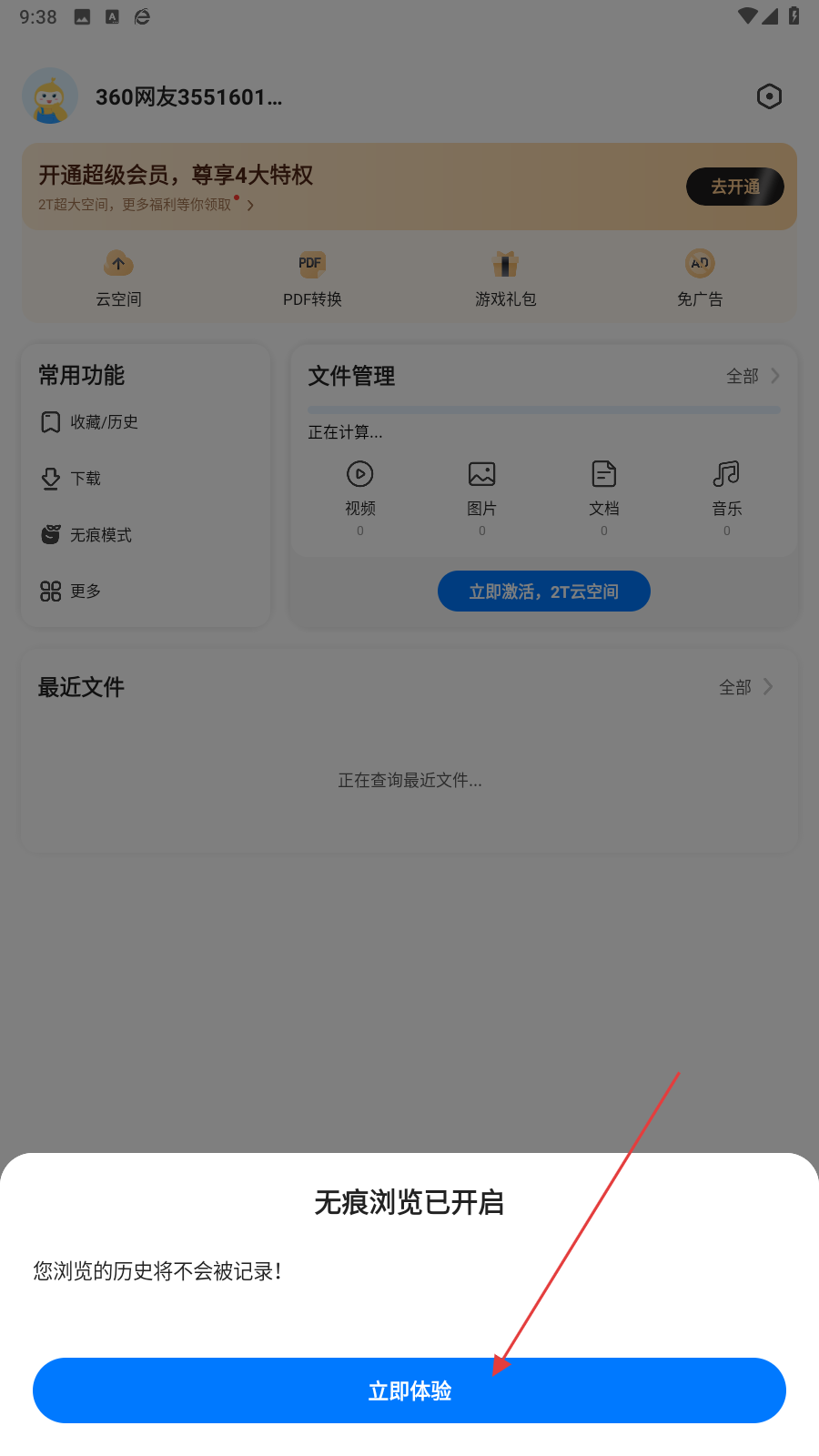 4、在下方跳出無(wú)痕瀏覽已開(kāi)啟后,點(diǎn)擊立即體驗(yàn)即可。