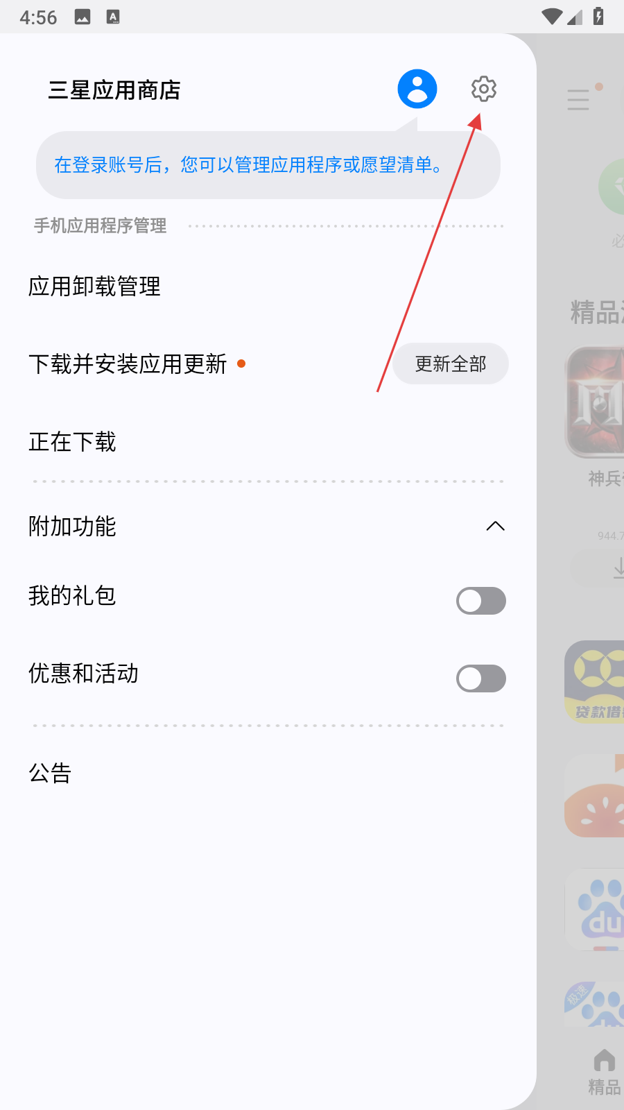 2、在彈出的側邊欄中,點擊右上角的設置圖標,進入三星應用商店設置頁面。