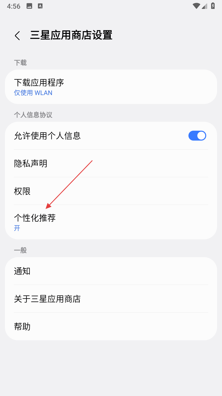 3、在設置頁面中,找到并點擊個性化推薦選項,進入個性化推薦設置頁面。